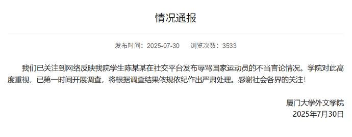 7月30日,厦门大学外文学院通报:“我们已关注到网络反映我院学生陈某某在社交平台发布辱骂国家运动员的不当言论情况。学院对此高度重视,已第一时间开展调查,将根据调查结果依规依纪作出严肃处理。”