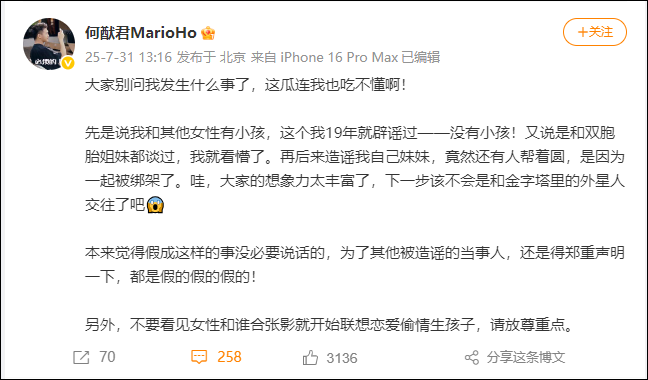 先是说我和其他女性有小孩,这个我19年就辟谣过——没有小孩!又说是和双胞胎姐妹都谈过,我就看懵了。再后来造谣我自己妹妹,竟然还有人帮着圆,是因为一起被绑架了。哇,大家的想象力太丰富了,下一步该不会是和金字塔里的外星人交往了吧。