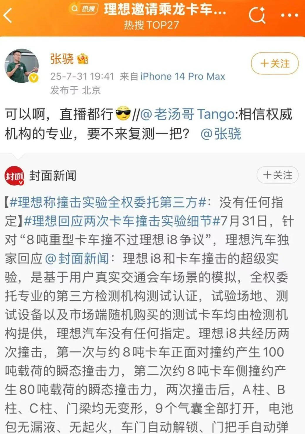 面对乘龙汽车发布的青泉声明,理想汽车似乎选择了硬刚。理想汽车产品负责人@老汤哥Tango 回应理想i8和卡车对撞事件,并表示:“相信权威机构的专业,要不来复测一把? @张骁 ”随后,理想汽车产品线负责人张骁回应:“可以啊,直播都行。”