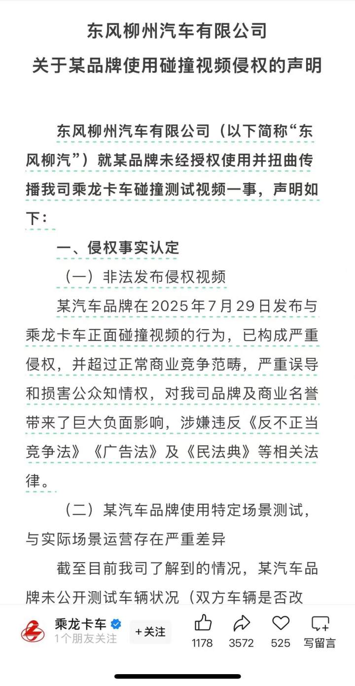 在“碰撞视频”发酵两天后,7月31日,东风柳州汽车有限公司发布关于某品牌使用碰撞视频侵权的声明。声明称,某汽车品牌在2025年7月29日发布与乘龙卡车正面碰撞视频的行为,已构成严重侵权,并超过正常商业竞争范畴,严重误导和损害公众知情权,对我司品牌及商业名誉带来了巨大负面影响,涉嫌违反《反不正当竞争法》《广告法》及《中华人民共和国民法典》等相关法律。