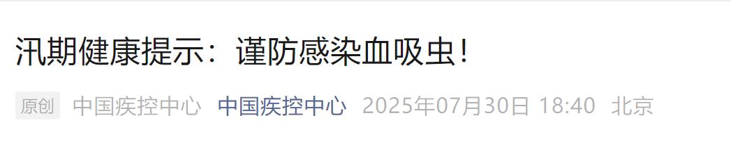 中国疾控中心发布紧急提醒,汛期在洪涝区域及水沟、沼泽和芦苇滩等地活动,应谨防血吸虫感染。