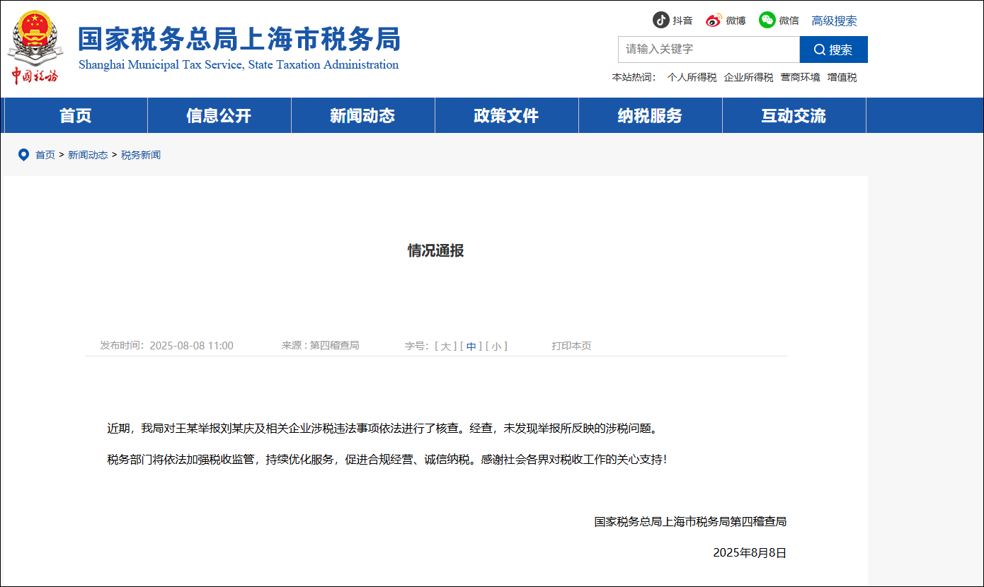 (原标题:上海市税务局:未发现刘某庆涉税问题,刘晓庆发声明回应)