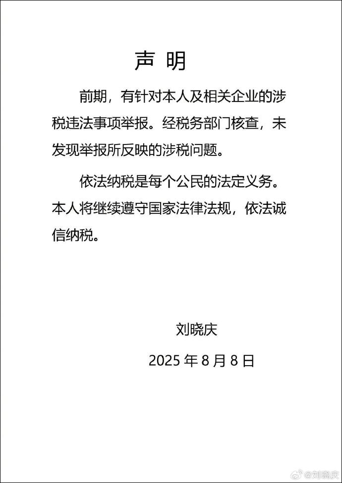 刚刚,刘晓庆发声明:经税务部门核查,未发现涉税问题。