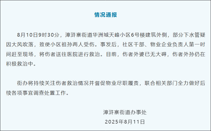 8月10日9时30分,漳浒寨街道华洲城天峰小区6号楼建筑外侧,部分下水管疑因大风吹落,致使小区祖孙两人受伤。