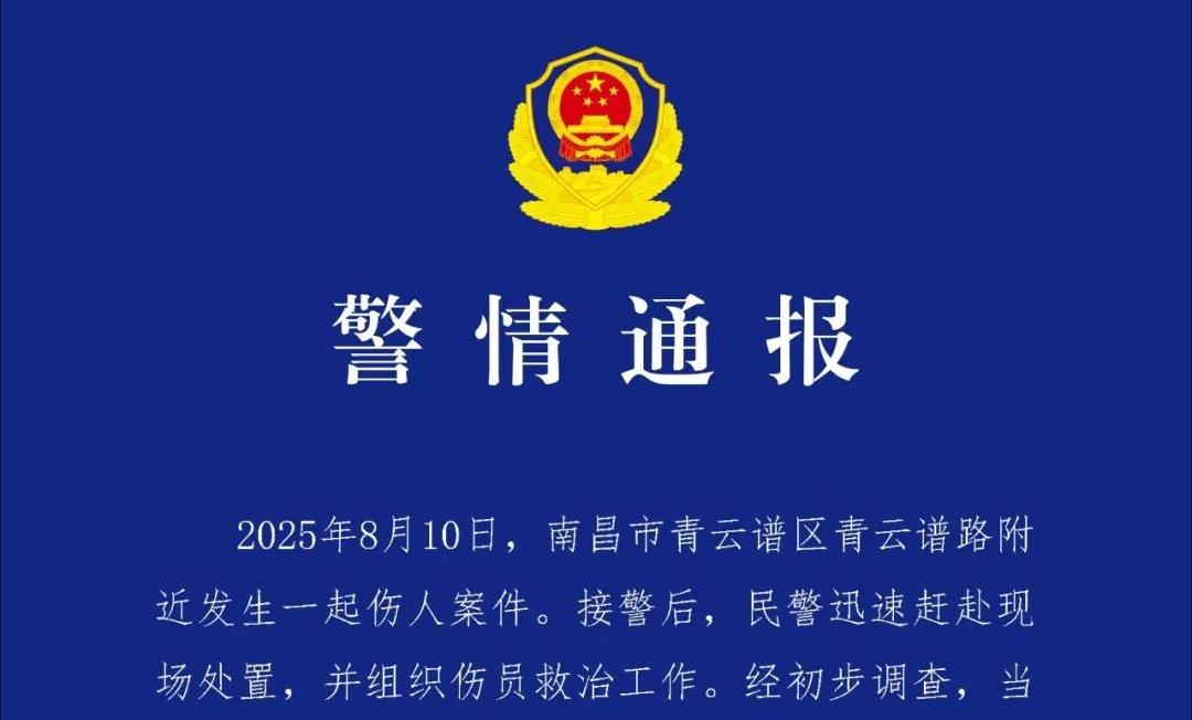 据南昌市公安局青云谱分局通报:2025年8月10日,南昌市青云谱区青云谱路附近发生一起伤人案件。接警后,民警迅速赶赴现场处置,并组织伤员救治工作。经初步调查,当日13时40分左右,犯罪嫌疑人席某某(男,23岁,江西高安人,有精神疾病诊疗史)持剪刀对刘某某和施某进行伤害,造成刘某某经抢救无效死亡,施某经送医院救治,无生命危险。