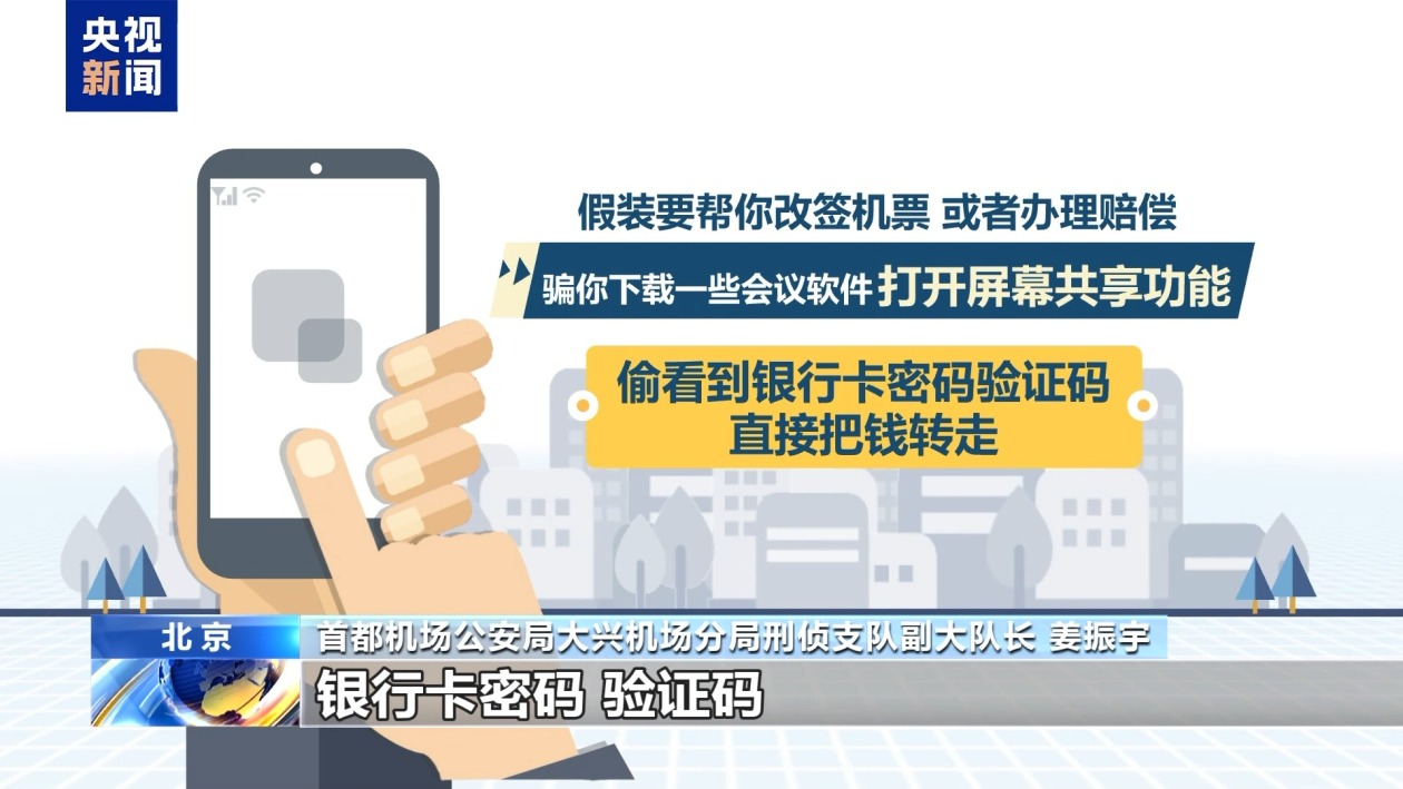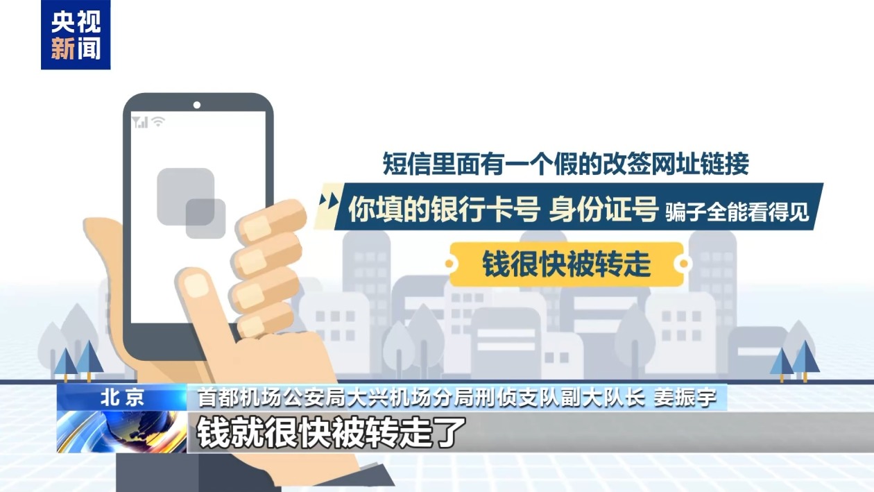 首都机场公安局大兴机场分局刑侦支队副大队长 姜振宇:机票退改签诈骗,是针对乘机旅客的一种电信诈骗方式。骗子假装航空公司或机场工作人员,给你打电话或发短信,说你乘坐的航班延误或者取消了,要帮你办理退票或改签,还能赔你钱。等你信了之后,就让你点击他们发送的网址链接,下载App或者进行屏幕共享,骗你输入银行卡号,密码验证码这些重要的信息,最后把你卡里的钱全部转走。