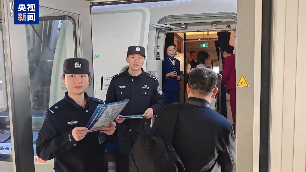 首都机场公安局警令处副处长 闫国宁:我们在一些热门的航班和一些热点的航线,民警登机开展反诈宣传,对于突出异常的情况,及时进行预警和劝阻,提高旅客的反诈意识,防止群众财物损失。