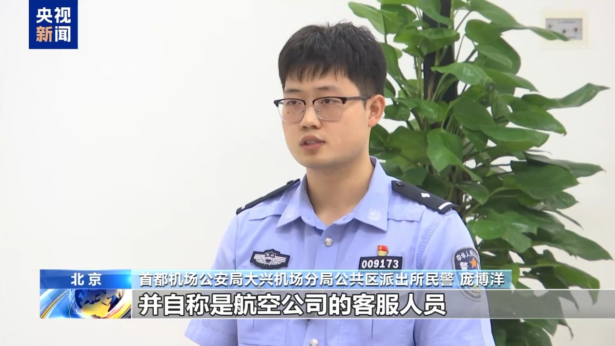 首都机场公安局大兴机场分局公共区派出所民警 庞博洋:当时我们在机场的一家酒店见到了谭某,谭某告诉我们,他在来机场的路上,接到了一个陌生电话,对方一开口,就准确地说出了他的航班信息,并自称是航空公司的客服人员,谭某便信以为真。对方说,他的航空延误险存在问题,甚至会造成一些征信影响。