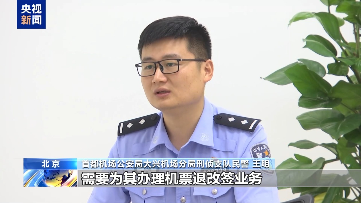 首都机场公安局大兴机场分局刑侦支队民警 王明:对方自称是机场的工作人员,因为天气原因导致航班延误,需要为其办理机票退改签业务,同时理赔300元资金。