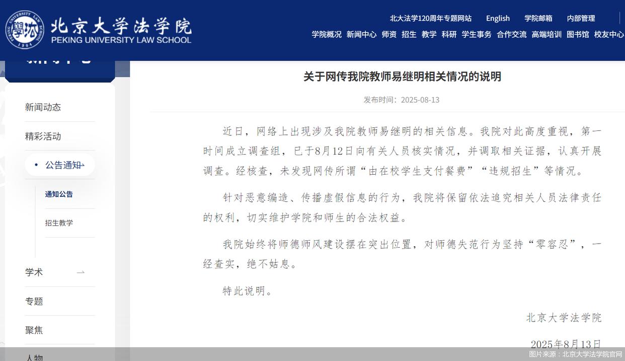 北京大学法学院网站8月13日发布《关于网传我院教师易继明相关情况的说明》: