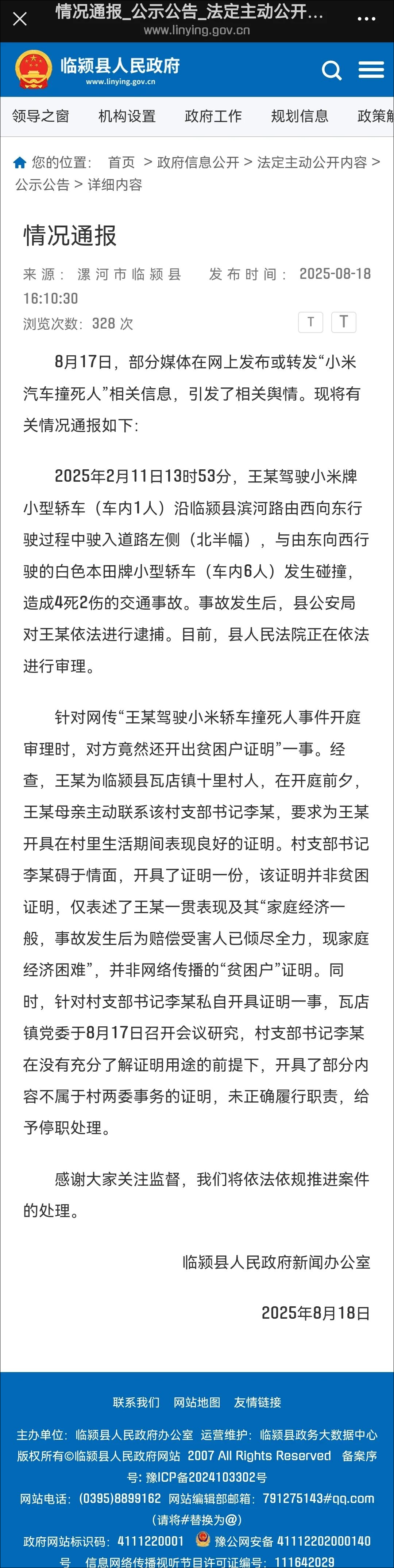 8月18日晚,河南临颍县人民政府新闻办公室发布情况通报: