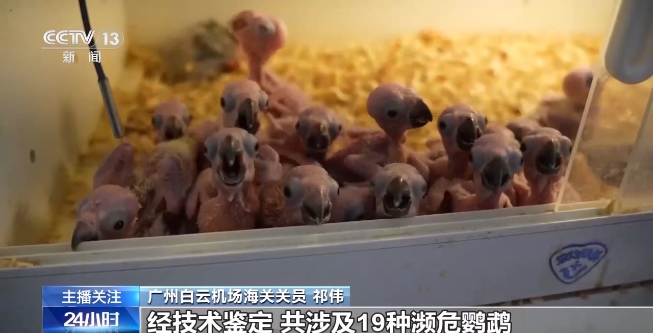 广州白云机场海关关员 祁伟:我们将这批鹦鹉蛋送到专业救护机构进行救助,其中100枚鸟蛋顺利孵化出鹦鹉。经技术鉴定,共涉及19种濒危鹦鹉,包括黄枕鹦哥、蓝翅金刚鹦鹉、毛里求斯鹦鹉、非洲灰鹦鹉等,均属于《濒危野生动植物种国际贸易公约》附录里列明的保护物种。