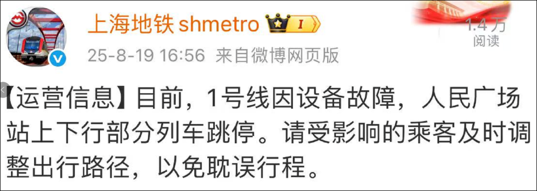 16点56分:目前,1号线因设备故障,人民广场站上下行部分列车跳停。请受影响的乘客及时调整出行路径,以免耽误行程。