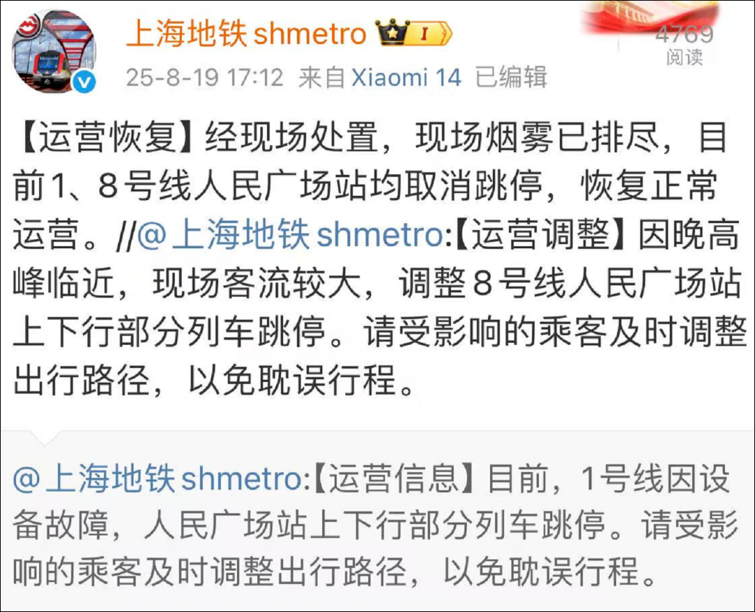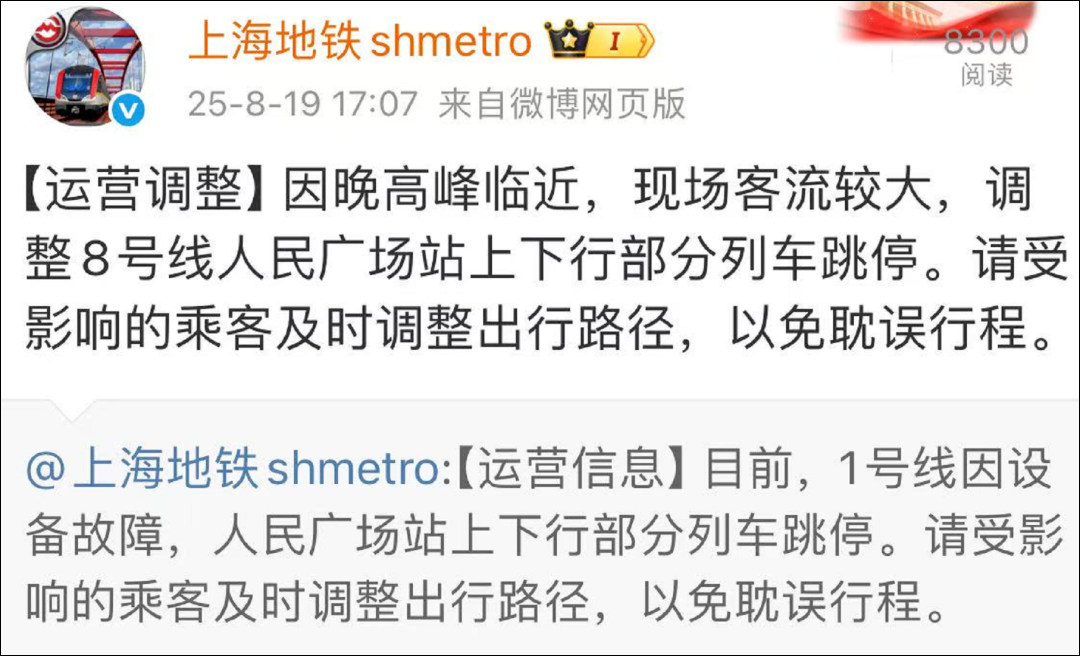 8月19日下午,不少网友在社交平台询问“地铁1号线人民广场站怎么了”?