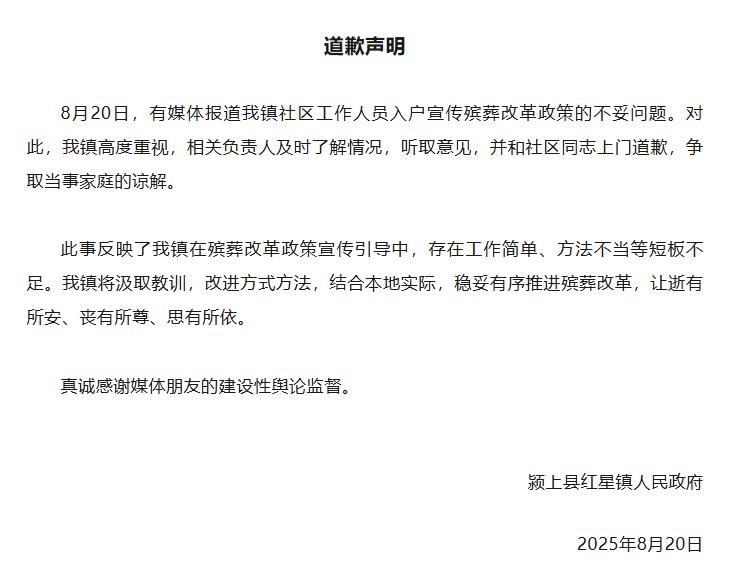 8月20日晚,安徽阜阳颍上县红星镇人民政府发布道歉声明: