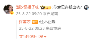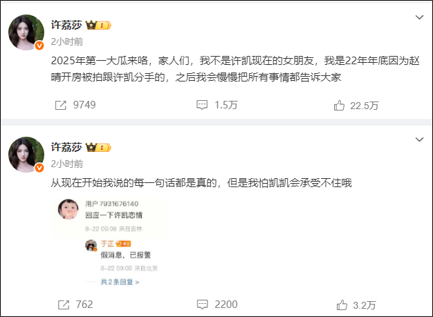 对于于正的说法,许荔莎连发两条微博:“从现在开始我说的每一句话都是真的,但是我怕凯凯会承受不住哦 。”还表示自己不是许凯现在的女朋友,“2025年第一大瓜来咯,家人们,我不是许凯现在的女朋友,我是22年年底因为赵晴开房被拍跟许凯分手的……”并且直接在评论区肯定了网友说许凯出轨的评论。