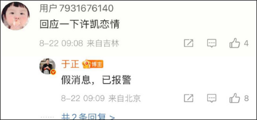 网友冲进许凯老板于正的微博评论区,求证恋情真实性,于正回复:“假消息,已报警。”