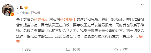 关于女演员@许荔莎 对我司@赵晴HT 的造谣和污蔑,我们已经取证,并且准备报警和提告诽谤,因为演员正在拍戏,要等收工之后去警局报案,同时我也联系了律师,后续会有警局回执和声明给到大家,我觉得微博不是公审的地方,把一切交给法律,相信法律的公正,远比公说公有理,婆说婆有理来得有意义,身正不怕影子斜,我誓与恶势力斗争到底。