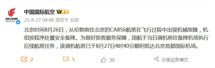 中新网8月27日电 据中国国际航空微博消息,北京时间8月26日,从伦敦前往北京的CA856航班在飞行过程中出现机械故障,机组按程序处置安全备降。为做好旅客服务保障,国航于当日调机前往备降机场执行后续航班任务,该调机航班已于8月27日4时40分顺利抵达北京首都国际机场。