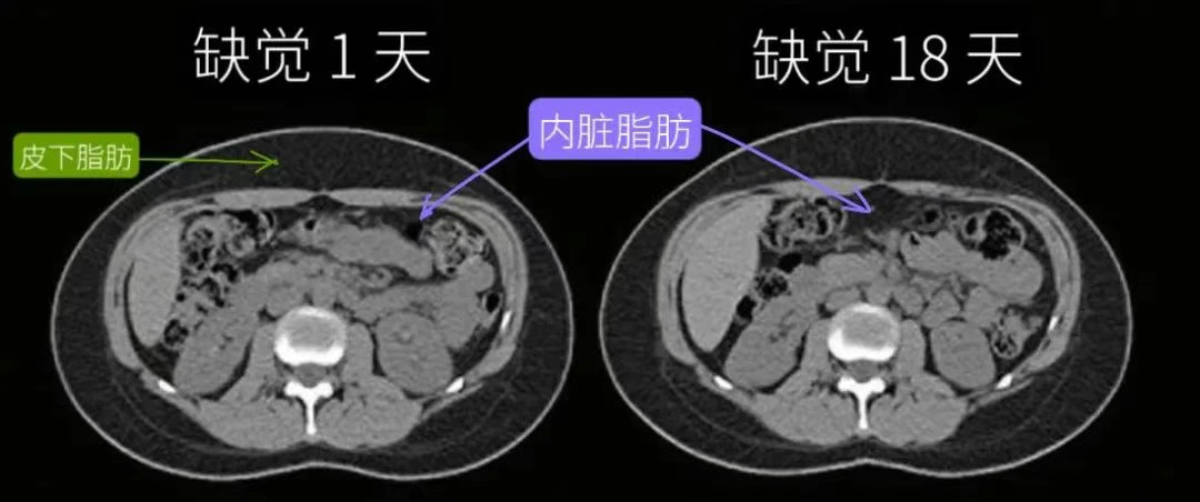 缺觉时脂肪存储机制变化,更容易把脂肪转移到肚子内部,变成“内脏脂肪”,包围各大内脏器官,损伤心血管、影响身体代谢。