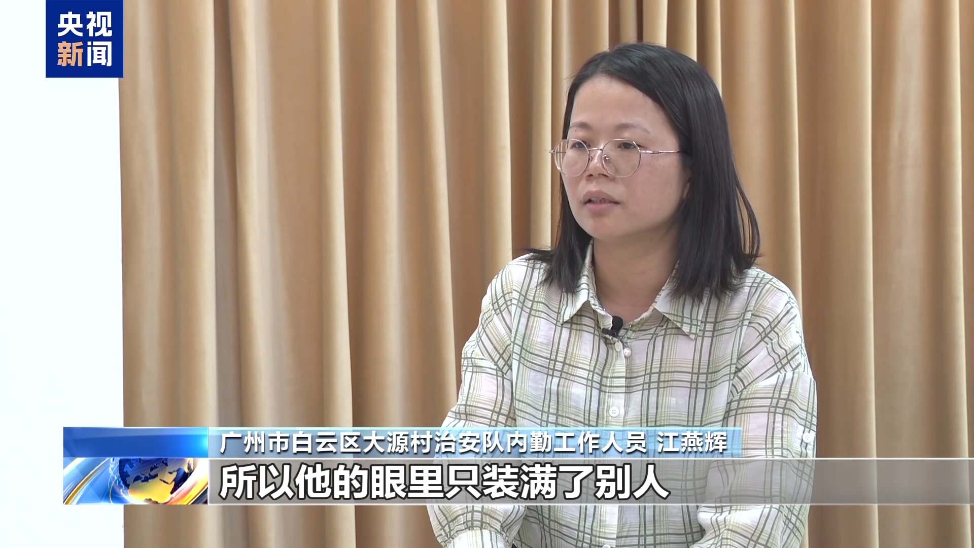 广州市白云区大源村治安队内勤工作人员 江燕辉:其实我找了很久,到处问,才只有那么几张。在工作上面,他心里装满了我们大源村的村民,一下班也是马上回家,照顾爸爸妈妈、儿女,所以他的眼里只装满了别人,从来就没有把自己放在第一位。他这个举动,救那两个同事,是出于本能、本性的举动。