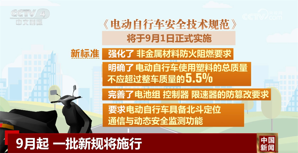 《电动自行车安全技术规范》将于9月1日正式实施。新标准强化了非金属材料防火阻燃要求;明确了电动自行车使用塑料的总质量不应超过整车质量的5.5%;完善了电池组、控制器、限速器的防篡改要求;要求电动自行车具备北斗定位、通信与动态安全监测功能。新标准实施后,将提升车辆整体安全性能,更好满足消费者日常使用需求。