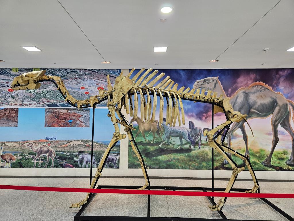 图为复原的金普巨副骆驼骨架,这副骨架被陈列在大连普湾经济区管委会。新华社记者 于也童 摄