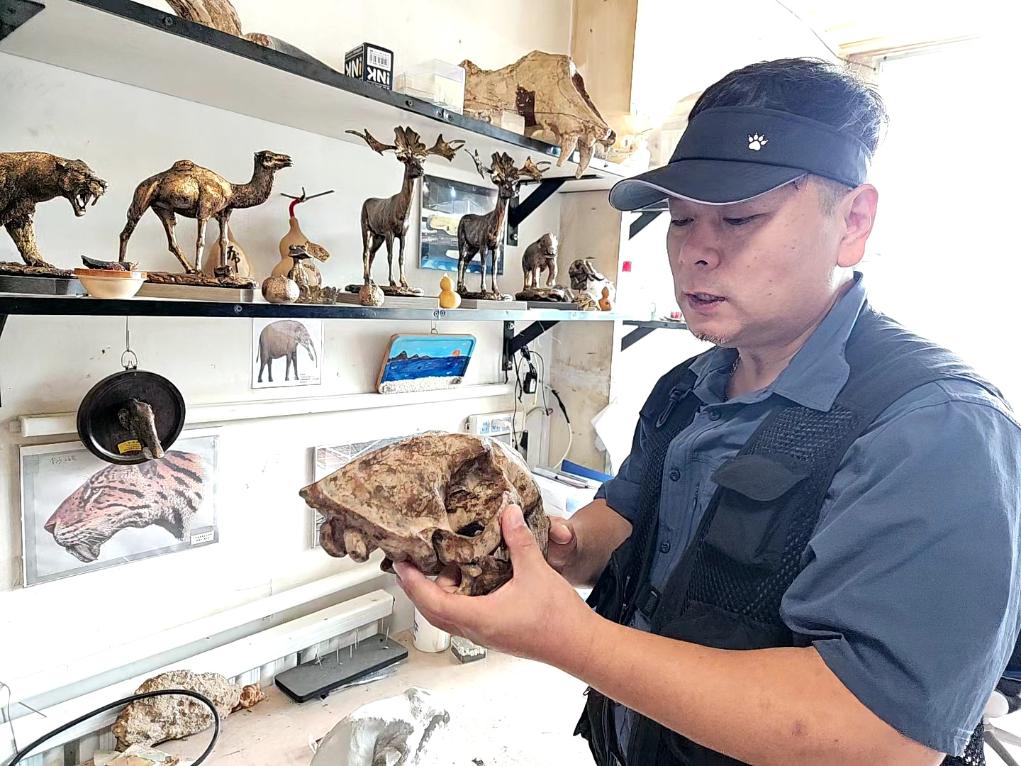 新华社沈阳8月31日电 走进位于大连市金普新区复州湾街道的一处工作室,一副高3.4米、宽1.5米、长4.5米的金普巨副骆驼骨架标本引人注目。身高1.76米的记者在它身下抬起头,只能看到这只巨兽的下颌骨。庞大的体型、微黄的骨骼,让它看起来与工作室内的现代文明有些“格格不入”。