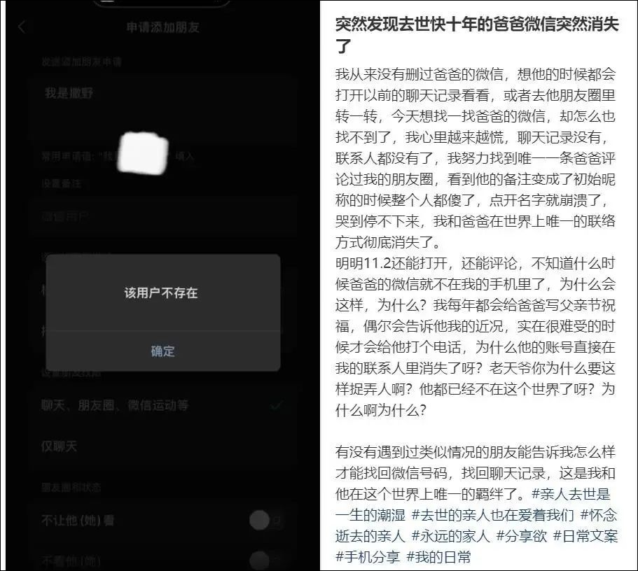 另据媒体此前报道,有网友发帖称,其爸爸去世近十年,想爸爸的时候会打开以前的聊天记录或者去看看爸爸的朋友圈,最近却找不到爸爸的微信了。这让网友觉得崩溃,“哭到停不下来,我和爸爸在世界上唯一的联络方式彻底消失了。”
