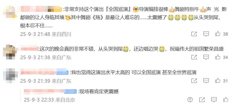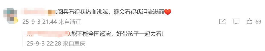 网友在观看过程中,纷纷留言评论,“阅兵看得我热血沸腾,晚会看得我泪流满面”“看得直起鸡皮疙瘩”“建议文艺晚会全国巡演”……