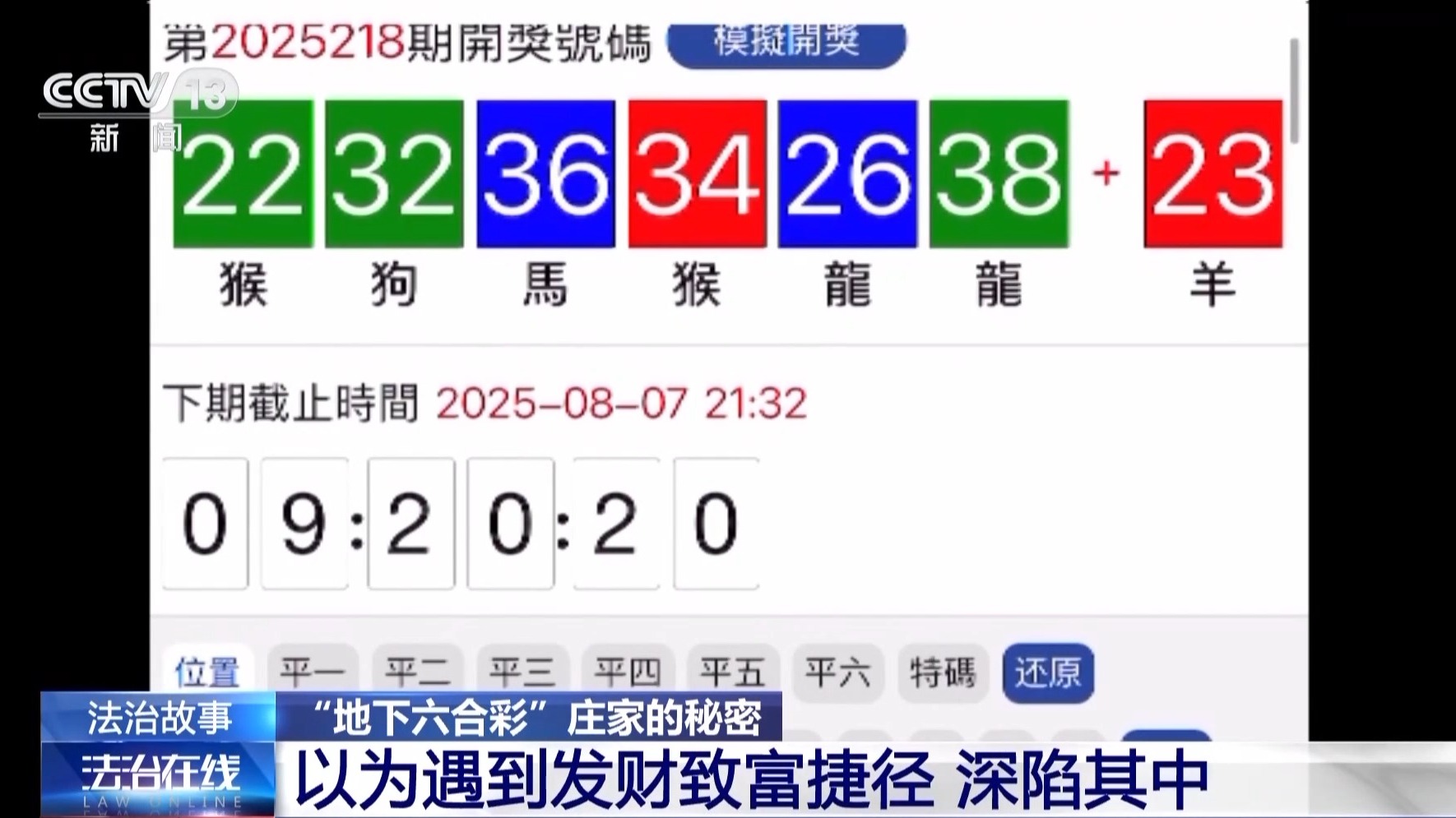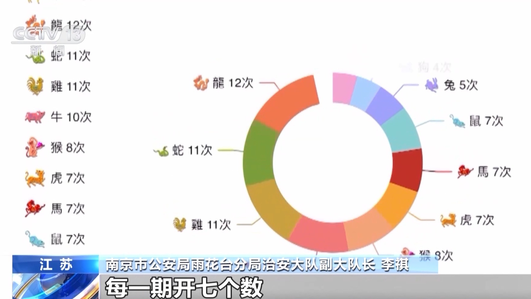 南京市公安局雨花台分局治安大队副大队长 李祺:它一共有四十九个数字、十二个生肖,每个生肖代表四个数,每一期开七个数,六个平码一个特码。只要买一个生肖,就相当于四个中奖概率。这个特码的话,它的赔率就很高,一比四十几。如果我买了一千块钱,能中到四万多。它的这个高赔率是吸引赌客的一个很重要的关键点。