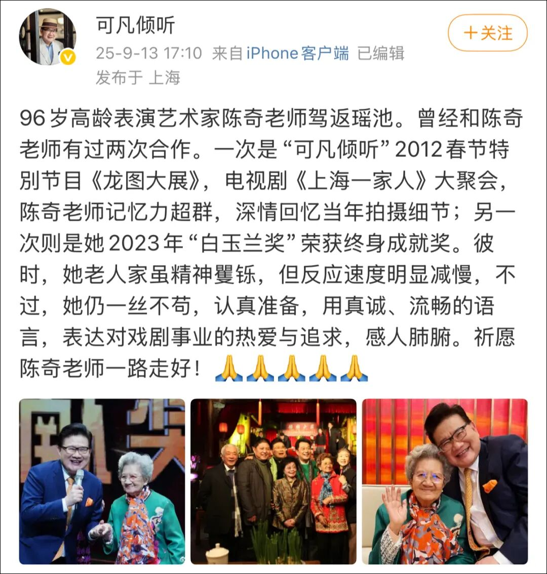 橙柿互动综合 有“国民奶奶”之誉的著名表演艺术家陈奇今天(9月13日)在上海去世,享年96岁。