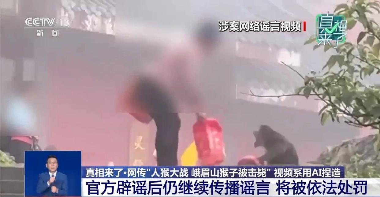 央视新闻讯 这段画面就是最近一段时间,网上流传的所谓四川峨眉山发生“人猴大战”的视频,在这段视频中,视频发布者一开始便展示了峨眉山猴子被击毙的场景,甚至还声称,峨眉山猴子抓伤幼儿,推倒老人致其瘫痪,将女游客推下山崖因此被景区工作人员枪毙。对于这些说法,峨眉山景区管委会已正式辟谣。而经警方核实,这些视频是由多地画面拼接而成,AI合成痕迹明显。截至目前,多名造谣者已被警方依法查处。