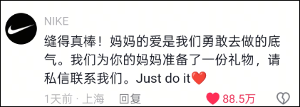 不久后,耐克体育(中国)有限公司官方账号“NIKE”在这条帖子下留言:“缝得真棒,妈妈的爱是我们勇敢去做的底气,我们为你的妈妈准备了一份礼物,请私信联系我们,just do it。”