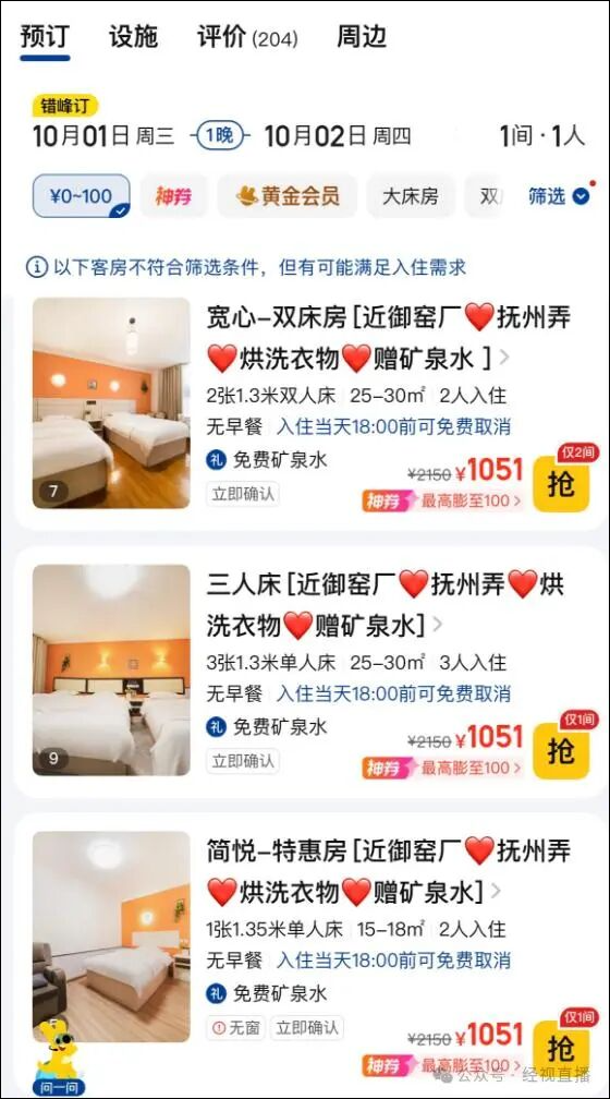 此前据广州日报报道,近日,有网友发帖称,江西景德镇空间酒店(御窑博物馆店)国庆假期期间一间房价格高达约1000元,而9月份同房型价格仅为90元左右,涨幅超过十倍,该网友直呼“太离谱了”。