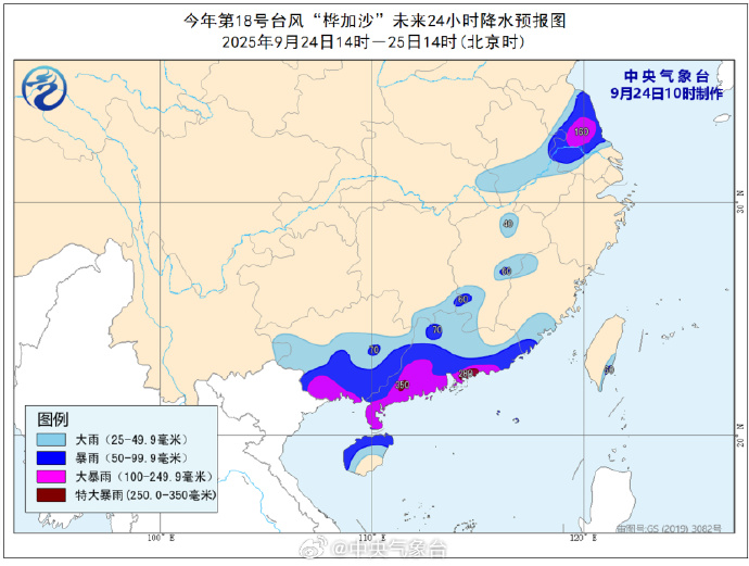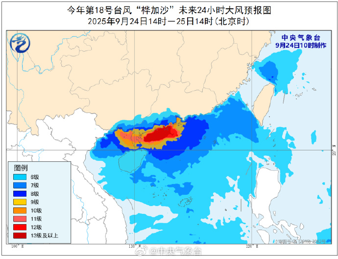 中央气象台消息 24日14时,“桦加沙”降至强台风级,中心附近最大风力有15级(50米/秒)。预计24日傍晚到夜间,它将在广东阳江到湛江一带沿海登陆(台风级或强台风级,13~15级,38~48米/秒)。广东中西部沿海地区的朋友们要加强防范强风雨天气可能带来的危害。