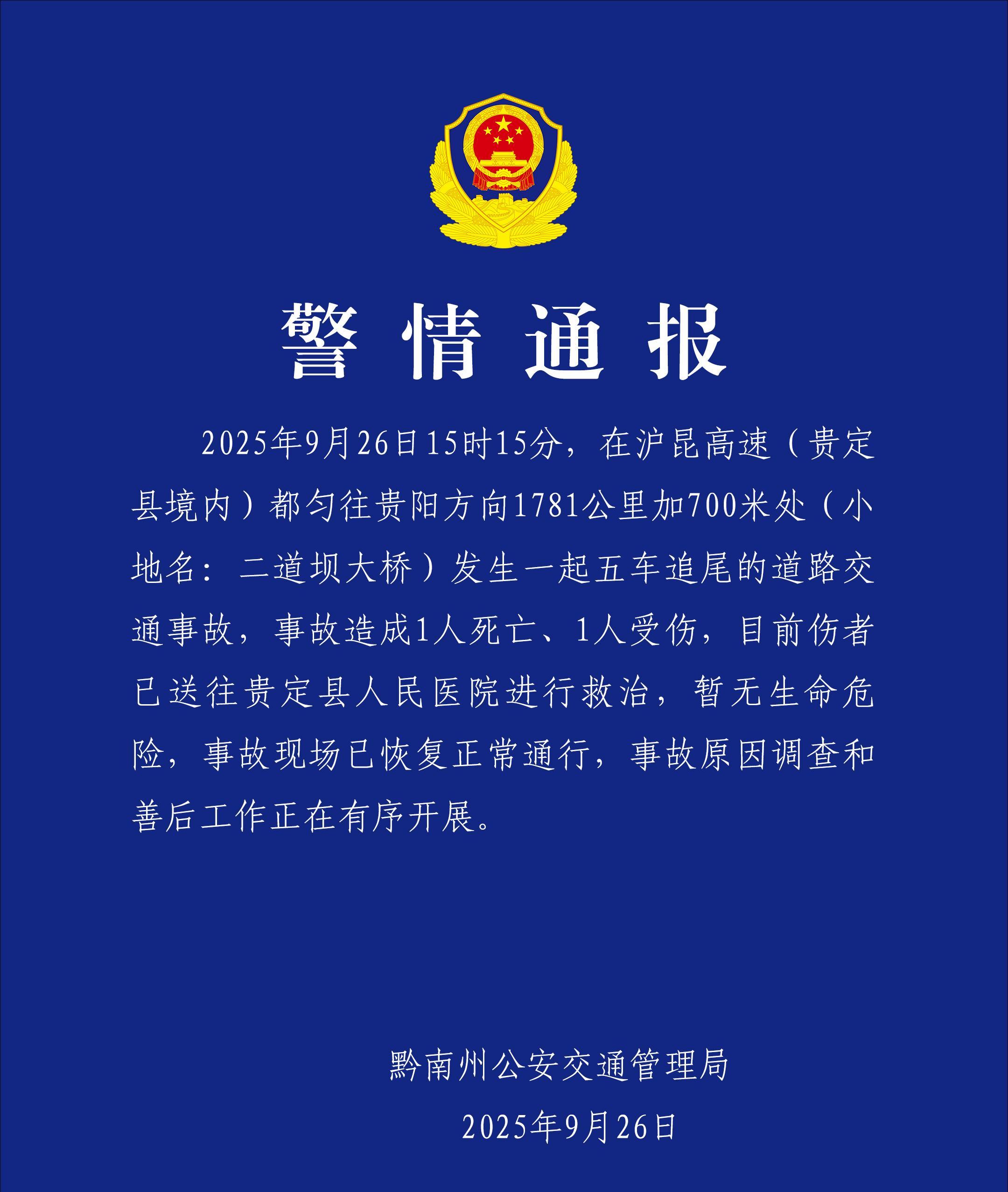 9月26日下午,沪昆高速贵州黔南州贵定县段二道坝大桥处,发生一起交通事故。