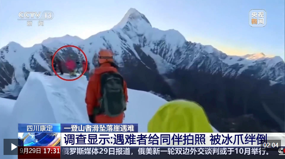 视频显示,一队登山者正在雪峰上行走,前方一名身穿红色衣服的登山者在起身时,突然身体前倾,随后快速向下滑坠。救援人员在距离滑坠地点落差约200米的地方找到他,登山者已经不幸遇难。