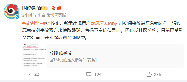 其表示,该用户是对交通事故进行营销炒作,通过恶意揣测事故双方来博取眼球,宣扬不良价值导向,违反社区公约。