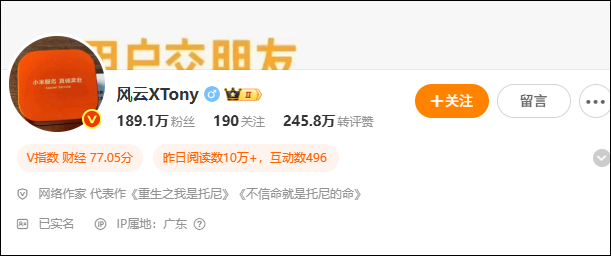 @风云XTony 的认证信息显示,其为网络作家,拥有189.1万粉丝。
