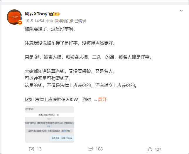 10月6日,@风云XTony 发文称 :“早说了,被陈震撞,是一种幸运。陈震车祸受害人账号注销了,明显就是陈震钱给到位了嘛,大几百万是有的。”