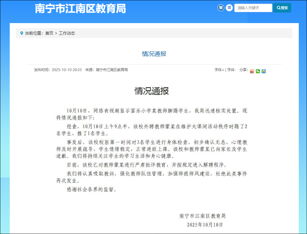 10月10日,广西南宁市江南区教育局发布情况通报:
