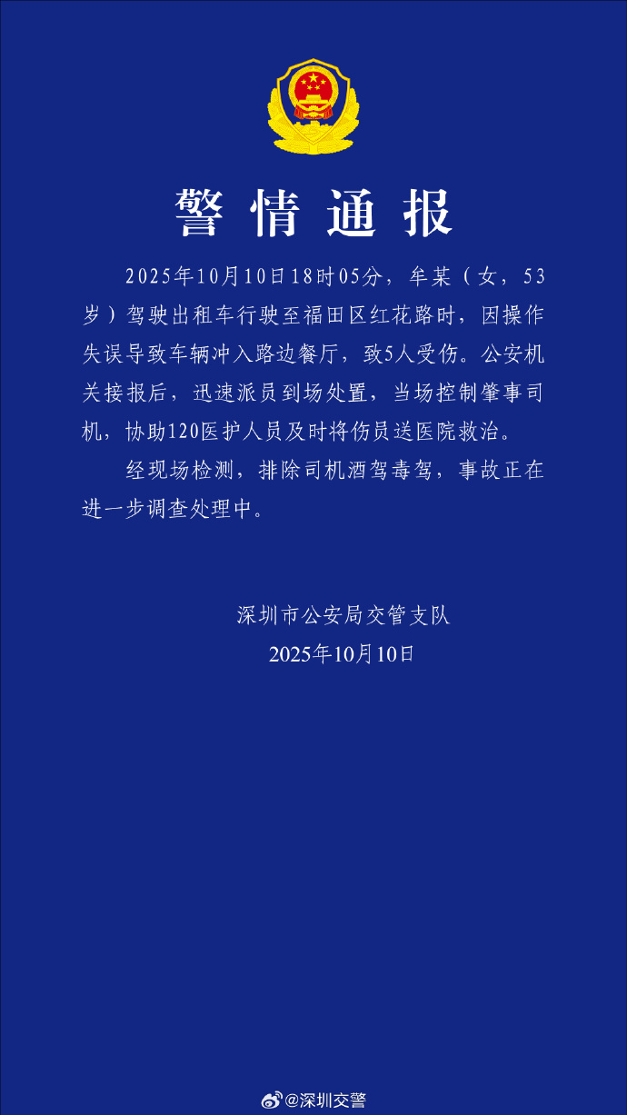 2025年10月10日18时05分,牟某(女,53岁)驾驶出租车行驶至福田区红花路时,因操作失误导致车辆冲入路边餐厅,致5人受伤。公安机关接报后,迅速派员到场处置,当场控制肇事司机,协助120医护人员及时将伤员送医院救治。