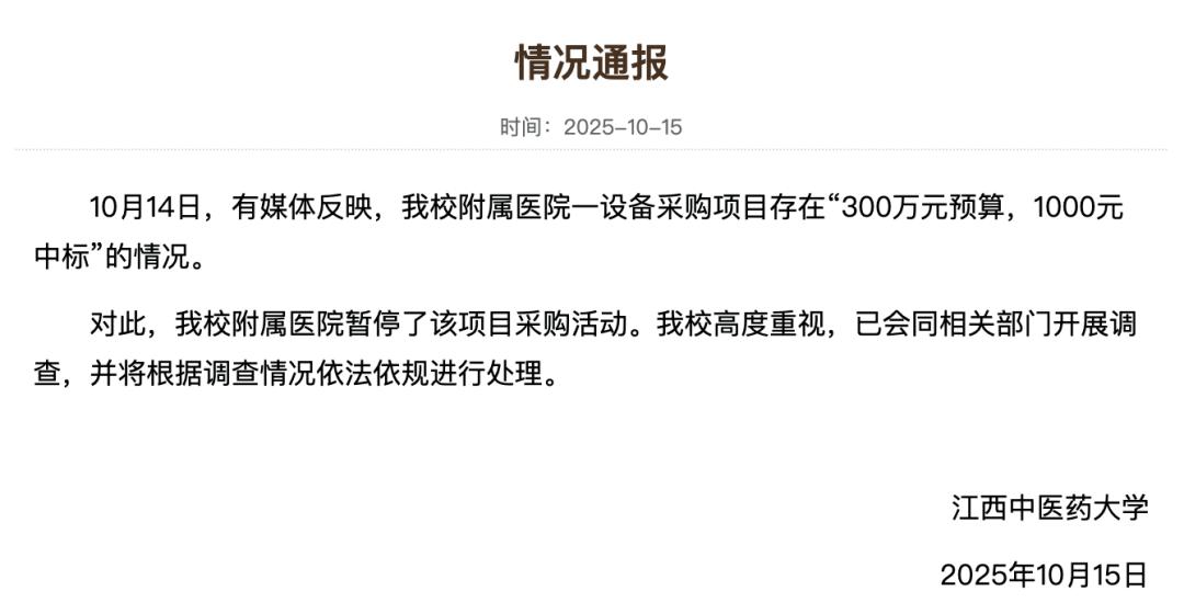 10月15日,江西中医药大学发布情况通报称,10月14日,有媒体反映,该校附属医院一设备采购项目存在“300万元预算,1000元中标”的情况。