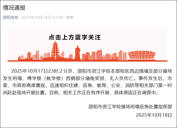 2025年10月17日23时2分许,邵阳市资江学校本部校区西边围墙及部分操场发生坍塌、博学楼(教学楼)西侧部分墙角受损,无人员伤亡。事件发生后,市委、市政府高度重视,迅速组织住建、应急、教育、公安、消防等相关部门第一时间赶赴现场开展处置。目前,相关工作正在有序开展,具体原因正在调查中。