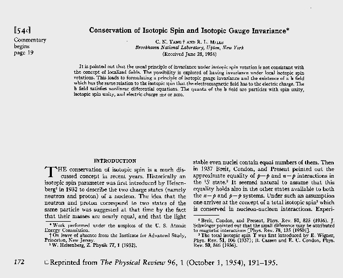 △1954年杨振宁与米尔斯关于“非阿贝尔规范场”的论文