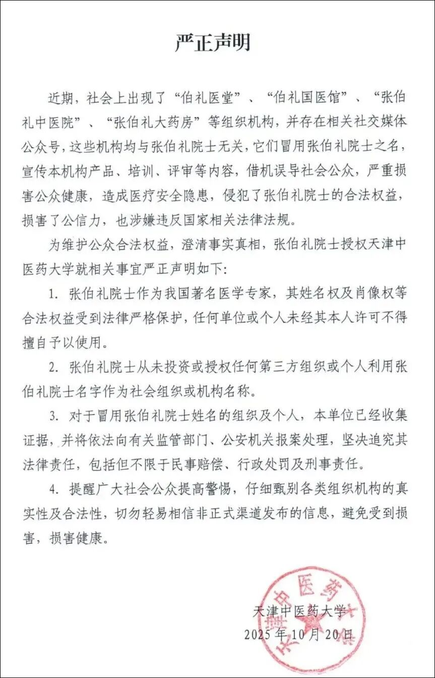 10月21日,天津中医药大学发布“严正声明”称,近期,社会上出现了“伯礼医堂”、“伯礼国医馆”、“张伯礼中医院”、“张伯礼大药房”等组织机构,并存在相关社交媒体公众号,这些机构均与张伯礼院士无关,它们冒用张伯礼院士之名,宣传相关机构产品、培训、评审等内容,借机误导社会公众,严重损害公众健康,造成医疗安全隐患,侵犯了张伯礼院士的合法权益,损害了公信力,也涉嫌违反国家相关法律法规。