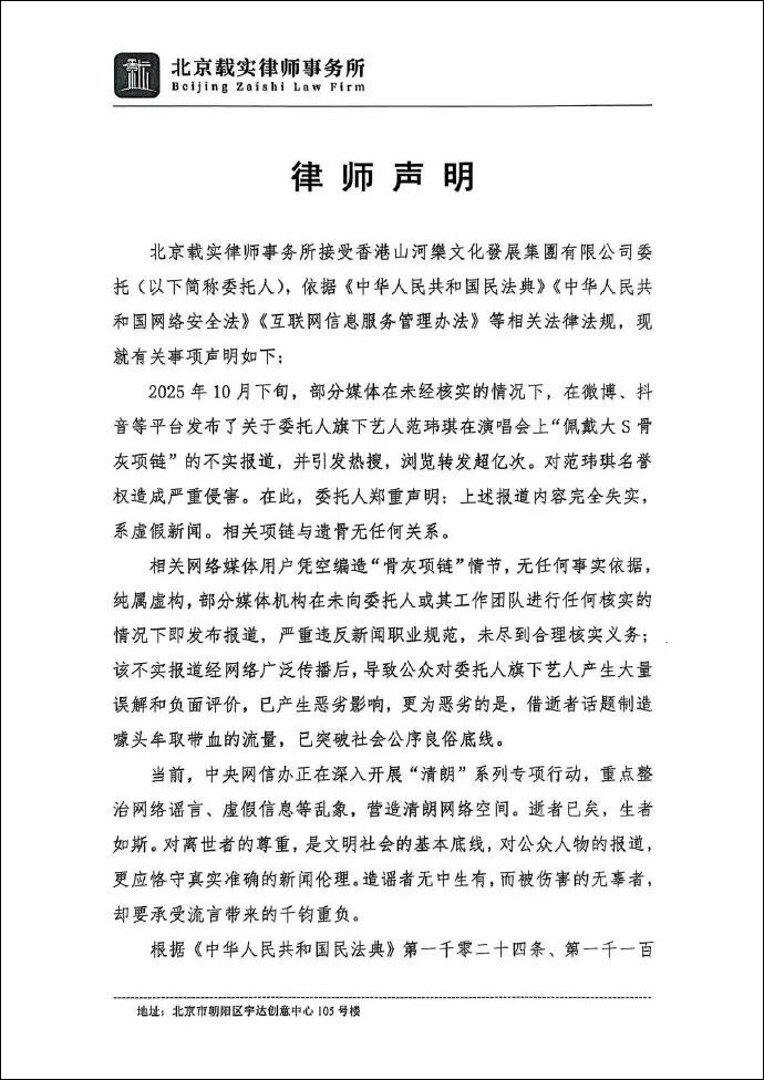 2025年10月下旬,部分媒体在未经核实的情况下,在微博、抖音等平台发布了关于委托人旗下艺人范玮琪在演唱会上“佩戴大S骨灰项链”的不实报道,并引发热搜,浏览转发超亿次。对范玮琪名誉权造成严重侵害。在此,委托人郑重声明:上述报道内容完全失实,系虚假新闻。相关项链与遗骨无任何关系。相关网络媒体用户凭空编造“骨灰项链”情节,无任何事实依据纯属虚构。