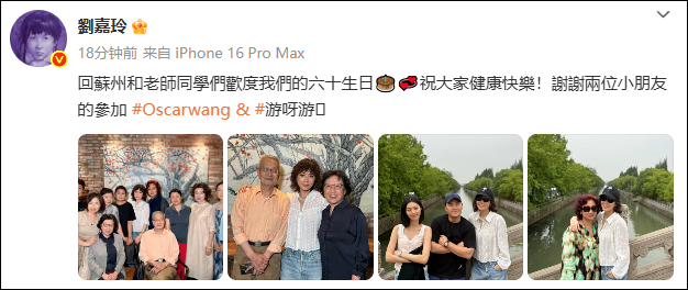 10月31日,刘嘉玲更新社交平台,晒出自己回苏州与老师聚会的照片,并配文:回苏州忆童年,50年师生情像老酒,越陈越醇。