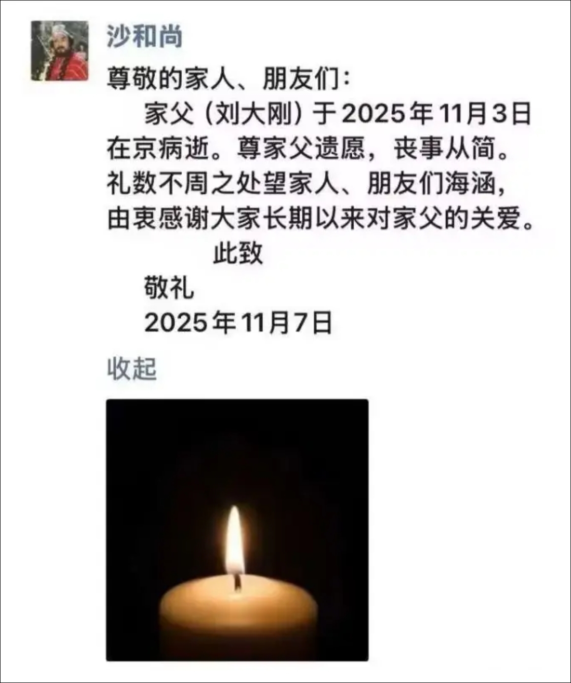 戏曲演员、豫剧大师马金凤弟子刘冰在社交平台上发文悼念刘大刚:“著名表演艺术家《西游记》沙僧扮演者刘大刚先生,于2025年11月3日在京病逝。缅怀前辈,一路走好,往生极乐!”